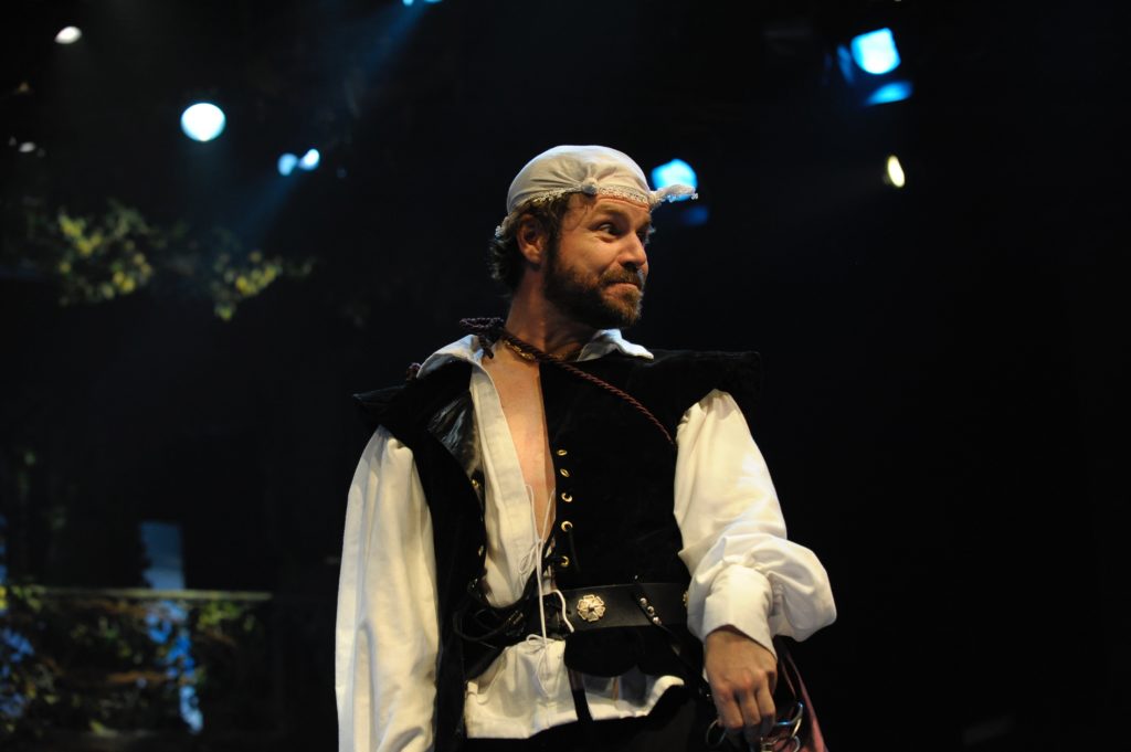 Ouellette begins the play at the end, with Romeo and Juliet lying dead in one another’s arms. Fair enough; why maintain the pretense when we all know how it’s going to end? His company then proceeds with a fairly traditional production. Romeo moans and complains, Juliet preens, Mercutio soliloquizes, the Nurse prattles. The scene is clearly set in the past – the costumes are period, the language archaic. But then we move to the Capulets’ ball, where the smitten teens first meet, and all at once we’re at a rager, with Pink’s “Raise Your Glass” blasting from the speakers. I didn’t even notice when R & J espied one another, the dissonance was so glaring.